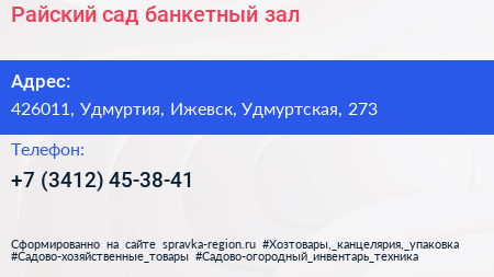 Райский сад, банкетный зал по адресу 426011, Удмуртия, Ижевск, Удмуртская, 273 в дальнейшем Организация, размещена в следующих категориях:
