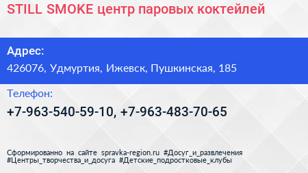 STILL SMOKE, центр паровых коктейлей по адресу 426076, Удмуртия, Ижевск, Пушкинская, 185 в дальнейшем Организация, размещена в следующих категориях: