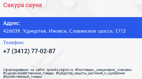 Сакура, сауна по адресу 426039, Удмуртия, Ижевск, Славянское шоссе, 17/2 в дальнейшем Организация, размещена в следующих категориях: