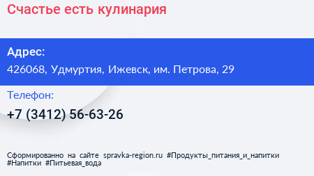 Счастье есть, кулинария по адресу 426068, Удмуртия, Ижевск, им. Петрова, 29 в дальнейшем Организация, размещена в следующих категориях: