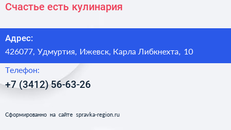 Счастье есть, кулинария по адресу 426077, Удмуртия, Ижевск, Карла Либкнехта, 10 в дальнейшем Организация, размещена в следующих категориях: