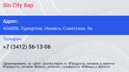 Sin City, бар по адресу 426008, Удмуртия, Ижевск, Советская, 8а в дальнейшем Организация, размещена в следующих категориях:
