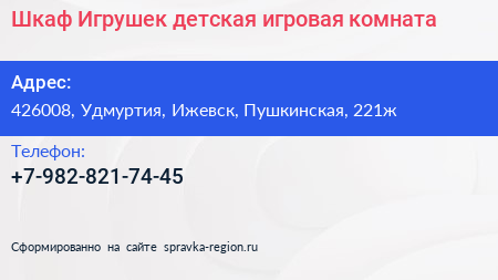 Шкаф Игрушек, детская игровая комната по адресу 426008, Удмуртия, Ижевск, Пушкинская, 221ж в дальнейшем Организация, размещена в следующих категориях: