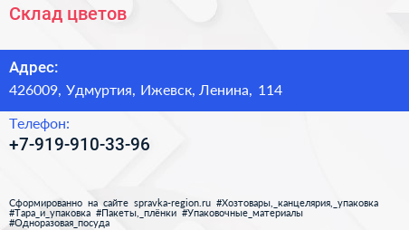 Склад цветов по адресу 426009, Удмуртия, Ижевск, Ленина, 114 в дальнейшем Организация, размещена в следующих категориях: