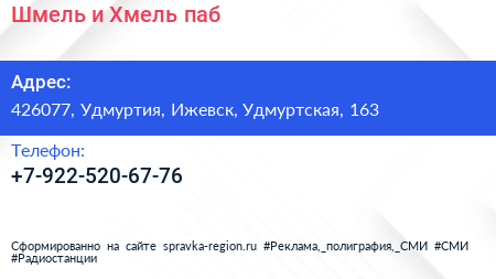 Шмель и Хмель, паб по адресу 426077, Удмуртия, Ижевск, Удмуртская, 163 в дальнейшем Организация, размещена в следующих категориях: