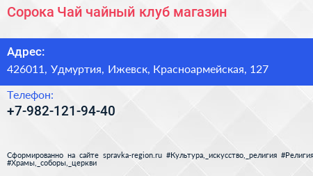 Сорока Чай, чайный клуб-магазин по адресу 426011, Удмуртия, Ижевск, Красноармейская, 127 в дальнейшем Организация, размещена в следующих категориях: