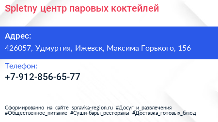 Spletny, центр паровых коктейлей по адресу 426057, Удмуртия, Ижевск, Максима Горького, 156 в дальнейшем Организация, размещена в следующих категориях: