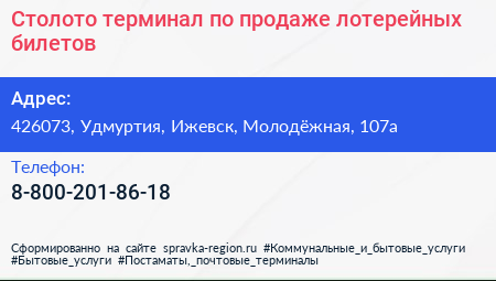 Столото, терминал по продаже лотерейных билетов по адресу 426073, Удмуртия, Ижевск, Молодёжная, 107а в дальнейшем Организация, размещена в следующих категориях: