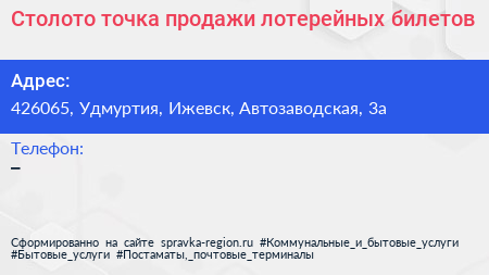 Столото, точка продажи лотерейных билетов по адресу 426065, Удмуртия, Ижевск, Автозаводская, 3а в дальнейшем Организация, размещена в следующих категориях: