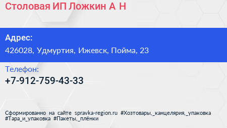 Столовая, ИП Ложкин А.Н. по адресу 426028, Удмуртия, Ижевск, Пойма, 23 в дальнейшем Организация, размещена в следующих категориях: