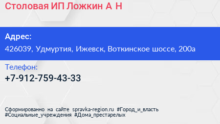 Столовая, ИП Ложкин А.Н. по адресу 426039, Удмуртия, Ижевск, Воткинское шоссе, 200а в дальнейшем Организация, размещена в следующих категориях: