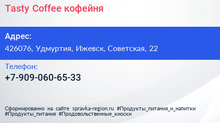 Tasty Coffee, кофейня по адресу 426076, Удмуртия, Ижевск, Советская, 22 в дальнейшем Организация, размещена в следующих категориях: