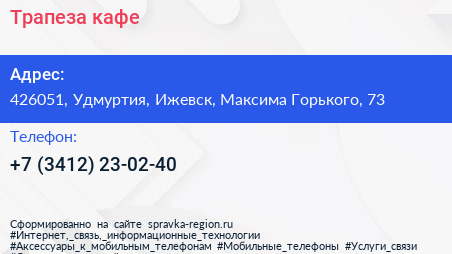Трапеза, кафе по адресу 426051, Удмуртия, Ижевск, Максима Горького, 73 в дальнейшем Организация, размещена в следующих категориях: