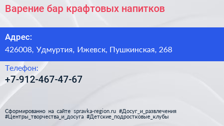 Варение, бар крафтовых напитков по адресу 426008, Удмуртия, Ижевск, Пушкинская, 268 в дальнейшем Организация, размещена в следующих категориях: