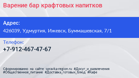 Варение, бар крафтовых напитков по адресу 426039, Удмуртия, Ижевск, Буммашевская, 7/1 в дальнейшем Организация, размещена в следующих категориях: