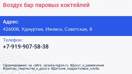 Воздух, бар паровых коктейлей по адресу 426008, Удмуртия, Ижевск, Советская, 8 в дальнейшем Организация, размещена в следующих категориях: