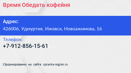 Время Обедать, кофейня по адресу 426006, Удмуртия, Ижевск, Новоажимова, 16 в дальнейшем Организация, размещена в следующих категориях: