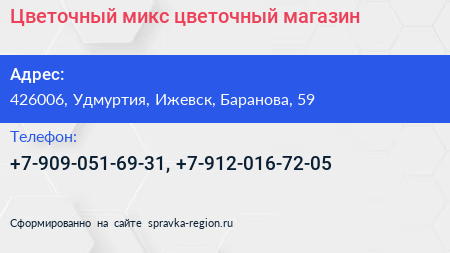 Цветочный микс, цветочный магазин по адресу 426006, Удмуртия, Ижевск, Баранова, 59 в дальнейшем Организация, размещена в следующих категориях: