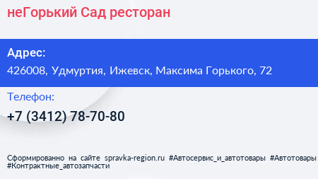 неГорький Сад, ресторан по адресу 426008, Удмуртия, Ижевск, Максима Горького, 72 в дальнейшем Организация, размещена в следующих категориях: