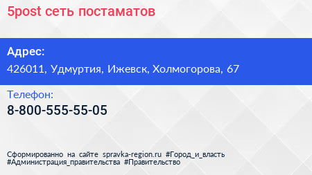 5post, сеть постаматов по адресу 426011, Удмуртия, Ижевск, Холмогорова, 67 в дальнейшем Организация, размещена в следующих категориях: