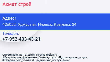Ахмат-строй по адресу 426052, Удмуртия, Ижевск, Крылова, 34 в дальнейшем Организация, размещена в следующих категориях: