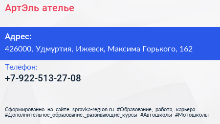 АртЭль, ателье по адресу 426000, Удмуртия, Ижевск, Максима Горького, 162 в дальнейшем Организация, размещена в следующих категориях: