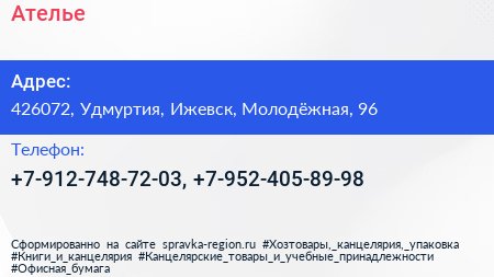 Ателье по адресу 426072, Удмуртия, Ижевск, Молодёжная, 96 в дальнейшем Организация, размещена в следующих категориях: