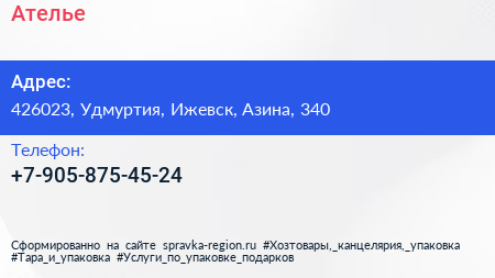Ателье по адресу 426023, Удмуртия, Ижевск, Азина, 340 в дальнейшем Организация, размещена в следующих категориях: