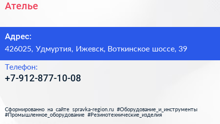 Ателье по адресу 426025, Удмуртия, Ижевск, Воткинское шоссе, 39 в дальнейшем Организация, размещена в следующих категориях: