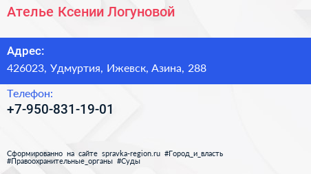 Ателье Ксении Логуновой по адресу 426023, Удмуртия, Ижевск, Азина, 288 в дальнейшем Организация, размещена в следующих категориях: