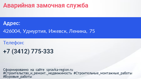 Аварийная замочная служба по адресу 426004, Удмуртия, Ижевск, Ленина, 75 в дальнейшем Организация, размещена в следующих категориях: