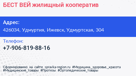 БЕСТ ВЕЙ, жилищный кооператив по адресу 426034, Удмуртия, Ижевск, Удмуртская, 304 в дальнейшем Организация, размещена в следующих категориях: