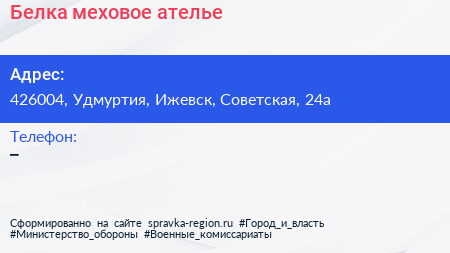 Белка, меховое ателье по адресу 426004, Удмуртия, Ижевск, Советская, 24а в дальнейшем Организация, размещена в следующих категориях: