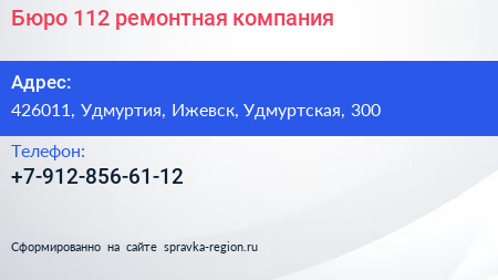 Бюро 112, ремонтная компания по адресу 426011, Удмуртия, Ижевск, Удмуртская, 300 в дальнейшем Организация, размещена в следующих категориях: