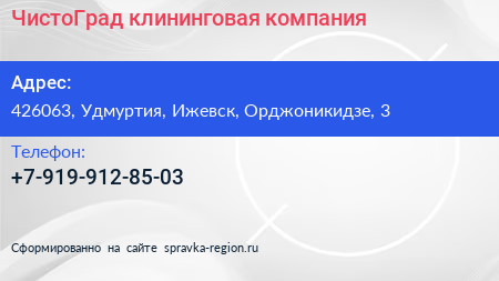 ЧистоГрад, клининговая компания по адресу 426063, Удмуртия, Ижевск, Орджоникидзе, 3 в дальнейшем Организация, размещена в следующих категориях: