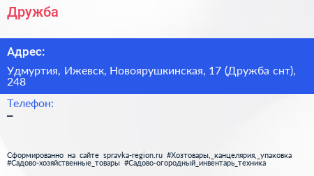 Дружба по адресу Удмуртия, Ижевск, Новоярушкинская, 17 (Дружба снт), 248 в дальнейшем Организация, размещена в следующих категориях: