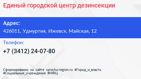 Единый городской центр дезинсекции по адресу 426011, Удмуртия, Ижевск, Майская, 12 в дальнейшем Организация, размещена в следующих категориях:
