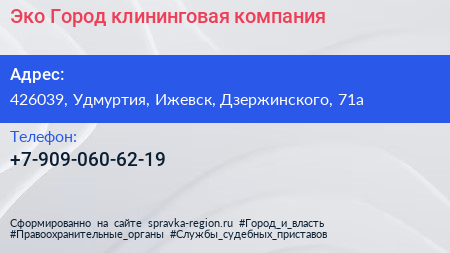 Эко Город, клининговая компания по адресу 426039, Удмуртия, Ижевск, Дзержинского, 71а в дальнейшем Организация, размещена в следующих категориях: