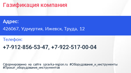 Газификация, компания по адресу 426067, Удмуртия, Ижевск, Труда, 12 в дальнейшем Организация, размещена в следующих категориях: