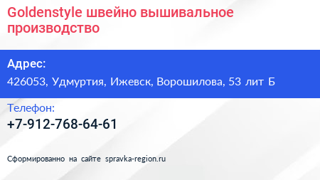Goldenstyle, швейно-вышивальное производство по адресу 426053, Удмуртия, Ижевск, Ворошилова, 53 лит Б в дальнейшем Организация, размещена в следующих категориях:
