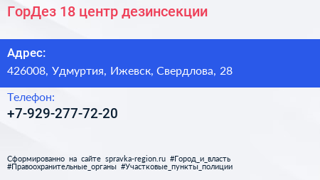 ГорДез 18, центр дезинсекции по адресу 426008, Удмуртия, Ижевск, Свердлова, 28 в дальнейшем Организация, размещена в следующих категориях: