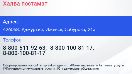 Халва, постамат по адресу 426068, Удмуртия, Ижевск, Сабурова, 21а в дальнейшем Организация, размещена в следующих категориях: