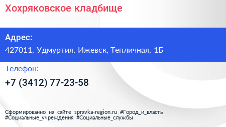 Хохряковское кладбище по адресу 427011, Удмуртия, Ижевск, Тепличная, 1Б в дальнейшем Организация, размещена в следующих категориях: