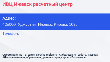 ИВЦ-Ижевск, расчетный центр по адресу 426000, Удмуртия, Ижевск, Кирова, 108а в дальнейшем Организация, размещена в следующих категориях: