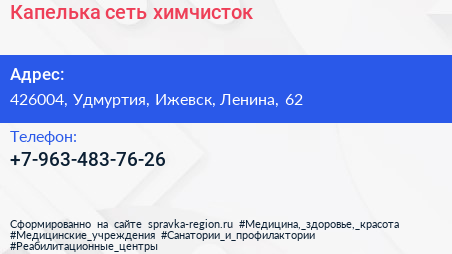 Капелька, сеть химчисток по адресу 426004, Удмуртия, Ижевск, Ленина, 62 в дальнейшем Организация, размещена в следующих категориях: