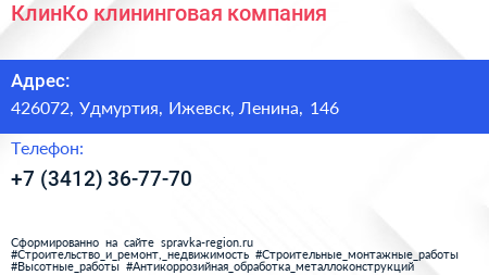 КлинКо, клининговая компания по адресу 426072, Удмуртия, Ижевск, Ленина, 146 в дальнейшем Организация, размещена в следующих категориях: