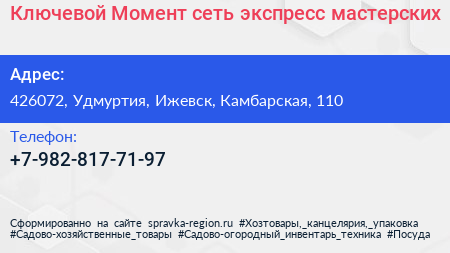 Ключевой Момент, сеть экспресс-мастерских по адресу 426072, Удмуртия, Ижевск, Камбарская, 110 в дальнейшем Организация, размещена в следующих категориях: