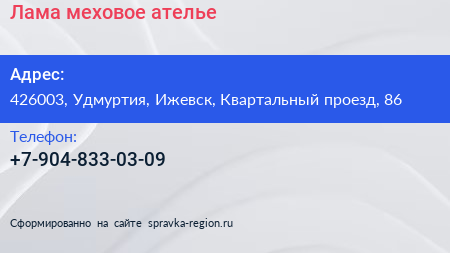 Лама, меховое ателье по адресу 426003, Удмуртия, Ижевск, Квартальный проезд, 86 в дальнейшем Организация, размещена в следующих категориях: