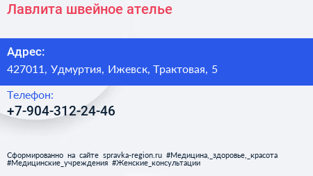 Лавлита, швейное ателье по адресу 427011, Удмуртия, Ижевск, Трактовая, 5 в дальнейшем Организация, размещена в следующих категориях: