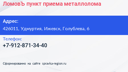 ЛомовЪ, пункт приема металлолома по адресу 426011, Удмуртия, Ижевск, Голублева, 6 в дальнейшем Организация, размещена в следующих категориях: